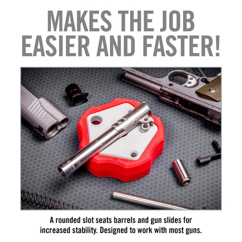 Műszaki minőségű gyantából készült, ez az intelligens tervezésű fegyverkovács blokk segít megvédeni a fegyverek felületét. A csúszásgátló külső gyűrű megakadályozza, hogy a blokk elcsússzon az asztalokon vagy a padon, miközben csapokat hajt. A beágyazott mágnes rögzíti és tartja a meghajtott csapokat, hogy azok ne guruljanak el. A lekerekített nyílás a csöveket és a pisztolycsúszdákat tartja a nagyobb stabilitás érdekében. Úgy tervezték, hogy a legtöbb fegyverrel működjön. Könnyebbé és gyorsabbá teszi a munkát! Ez a mérnöki minőségű gyantából készült blokk segít megvédeni a pisztolyok felületét. A külső gumibetét megakadályozza, hogy a blokk elcsússzon semmilyen felületen, amikor csapokat hajt. A blokk belsejében pedig egy mágnes található, amely megragadja a leejtett tűket. Annyira intelligensen megtervezett, hogy okosabbnak fogja érezni magát, ha csak használja.