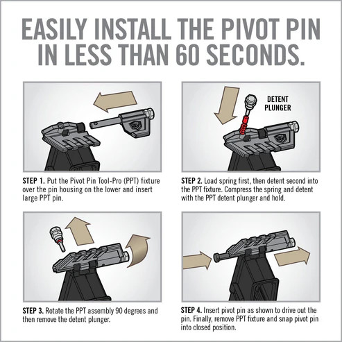 Most pedig ássuk be az AR15 Pivot Pin Tool-Pro funkcióit négy egyszerű lépésben. Ezzel az eszközzel könnyedén telepítheti a forgócsapot az AR-be, anélkül, hogy attól kellene tartania, hogy elveszíti a rugót vagy a rögzítést.