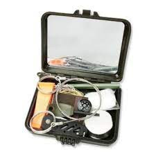 kés, pipa, drótfűrész, drót, horgászkészlet, vatta, gyertya, ceruza, mini iránytű, varrókészlet, biztosítótűk, tűzgyújtók, tükrök, túlélési utasítások, balesetértékelési jelentés