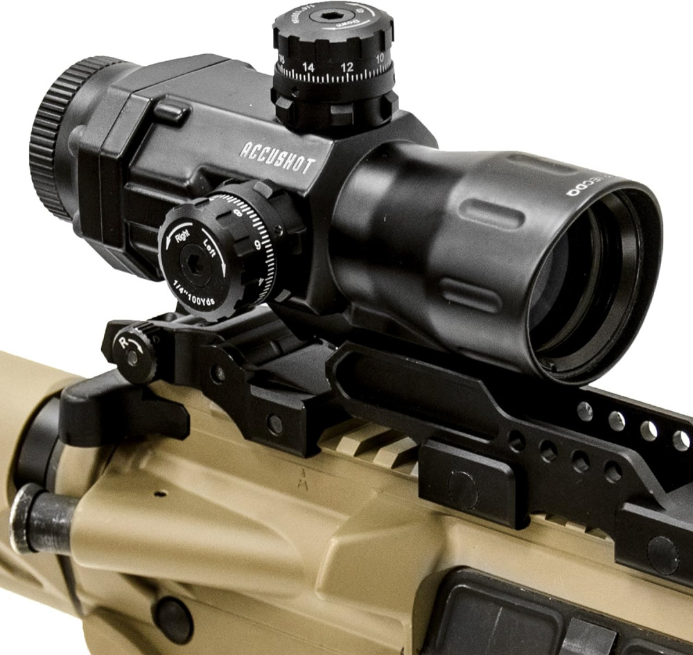 – 34 mm-es csőátmérő Többszörös smaragd bevonatú lencsék a maximális fényáteresztésért, a tükröződés megelőzéséért és a széltől a szélig tisztaságért, maratott üveg T-Dot irányzékkal, amelyet általában T-zónában és középső tömegcélzó alkalmazásokban használnak